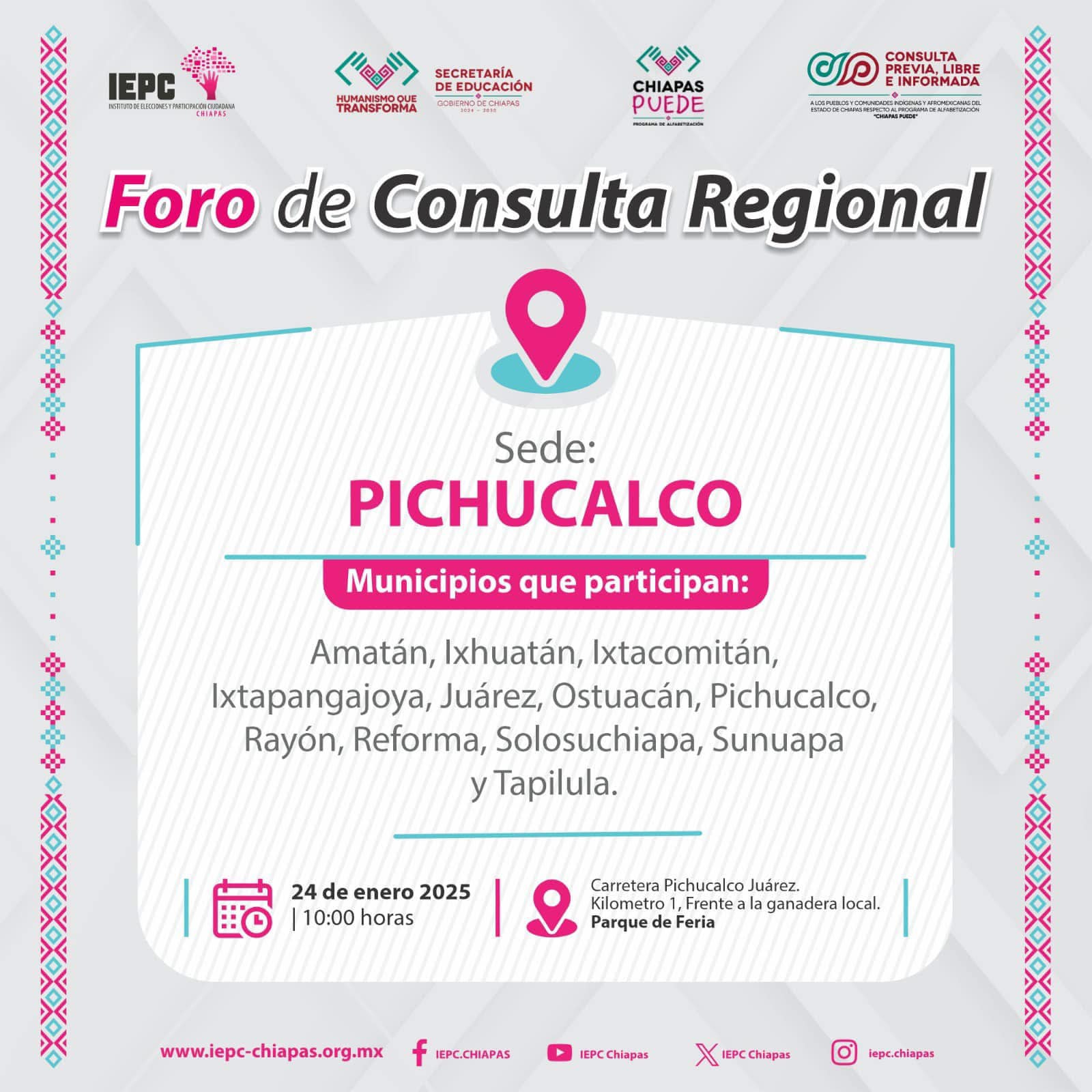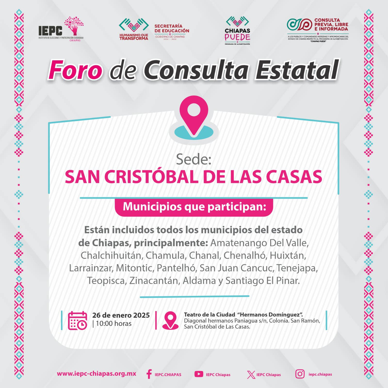 Lugar: En los municipios de: Aldama, Altamirano, Amatan, Amatenango del valle, Bochil, El Bosque, Chalchihuitan, Chanal, Chamula, Chapultenango, Chenalho, Chilón, Coapilla, Copainalá, Francisco León, Huitiupán, Huixtán, Ixhuatán, Ixtacomitán, Jitotol, Larrainzar, Maravilla Tenejapa, Las Margaritas, Marqués de Comillas, Mitontic, Ocosingo, Ocotepec, Palenque, Pantepec, Rayón, Rincón Chamula, Sabanilla, Salto de agua, Santiago el Pinar, San Andrés Duraznal , San Juan Cancuc, San Lucas, Simojovel, Sitala, Soyalo, Sunuapa, Tecpatán, Tapalapa, Tenejapa, Teopisca, Tila – Limar, Tumbala, Venustiano Carranza, Yajalón, Zinacantán.