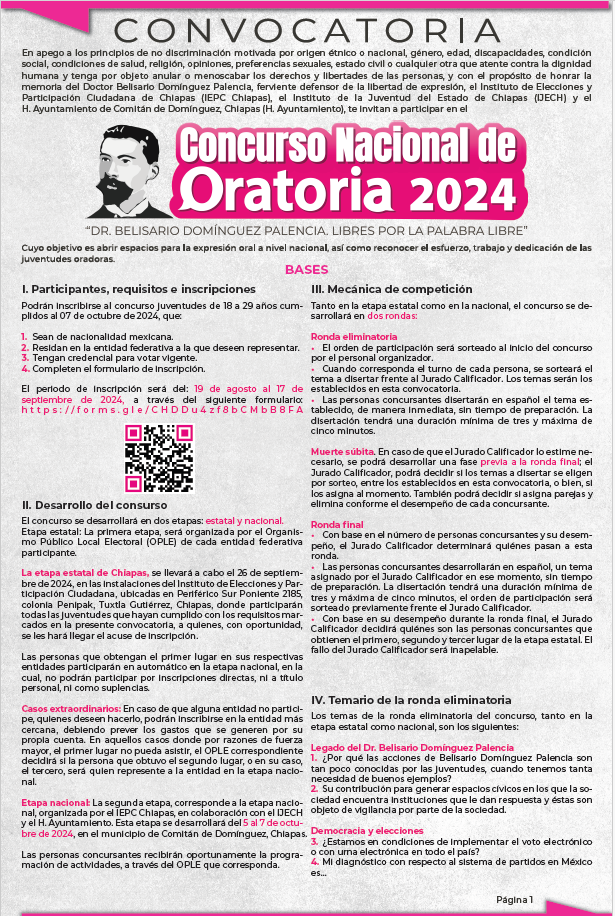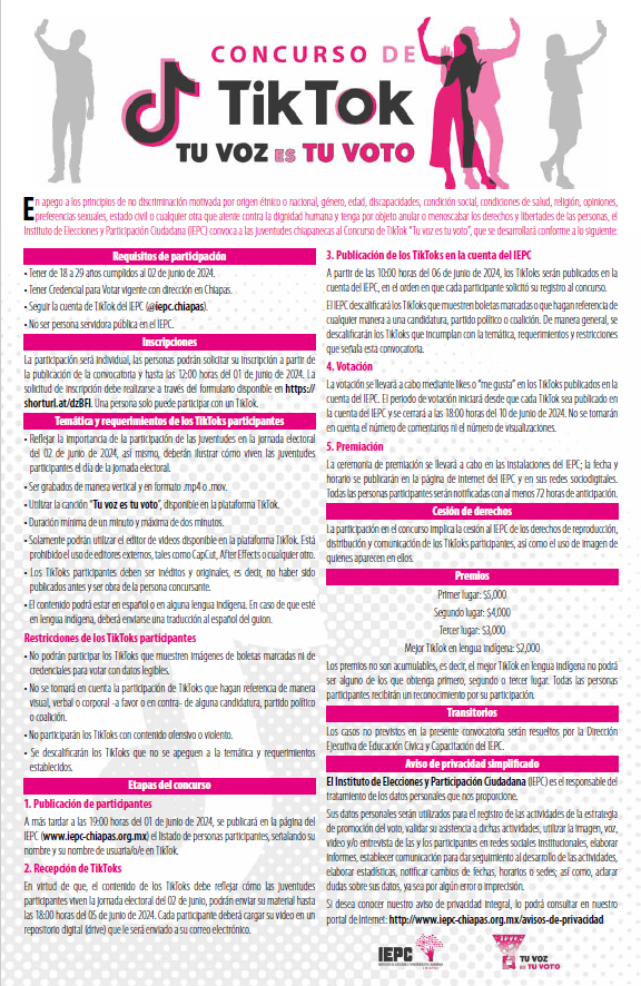 El Instituto de Elecciones y Participación Ciudadana (IEPC) es el responsable del tratamiento de los datos personales que nos proporcione. Sus datos personales serán utilizados con la finalidad de realizar el registro de los participantes a los eventos de Participación Ciudadana organizados por la Dirección Ejecutiva de Participación Ciudadana: talleres, cursos, foros, seminarios, campañas de promoción, concursos, capacitaciones, reuniones de trabajo, firmas de convenios, cursos en línea, serán incorporados a un directorio para posteriores invitaciones, así como para aclarar dudas sobre sus datos, ya sea por algún error o imprecisión, notificación de cancelación o cambio de horario, fecha y/o sede o cualquier imprevisto que se pueda suscitar. Si desea conocer nuestro aviso de privacidad integral, lo podrá consultar en nuestro portal de Internet: http://www.iepc-chiapas.org.mx/avisos-de-privacidad