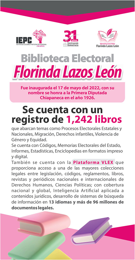 Con la finalidad de brindar un espacio de consulta de información electoral y lectura para la ciudadania, el Instituto de Eleccciones y Participación Ciudadana, pondrá a su disposición la Biblioteca Electoral "Florinda Lazos", la cual contará con espacio de lectura, acceso a internet, bibliografia electoral de nuestro Estado.