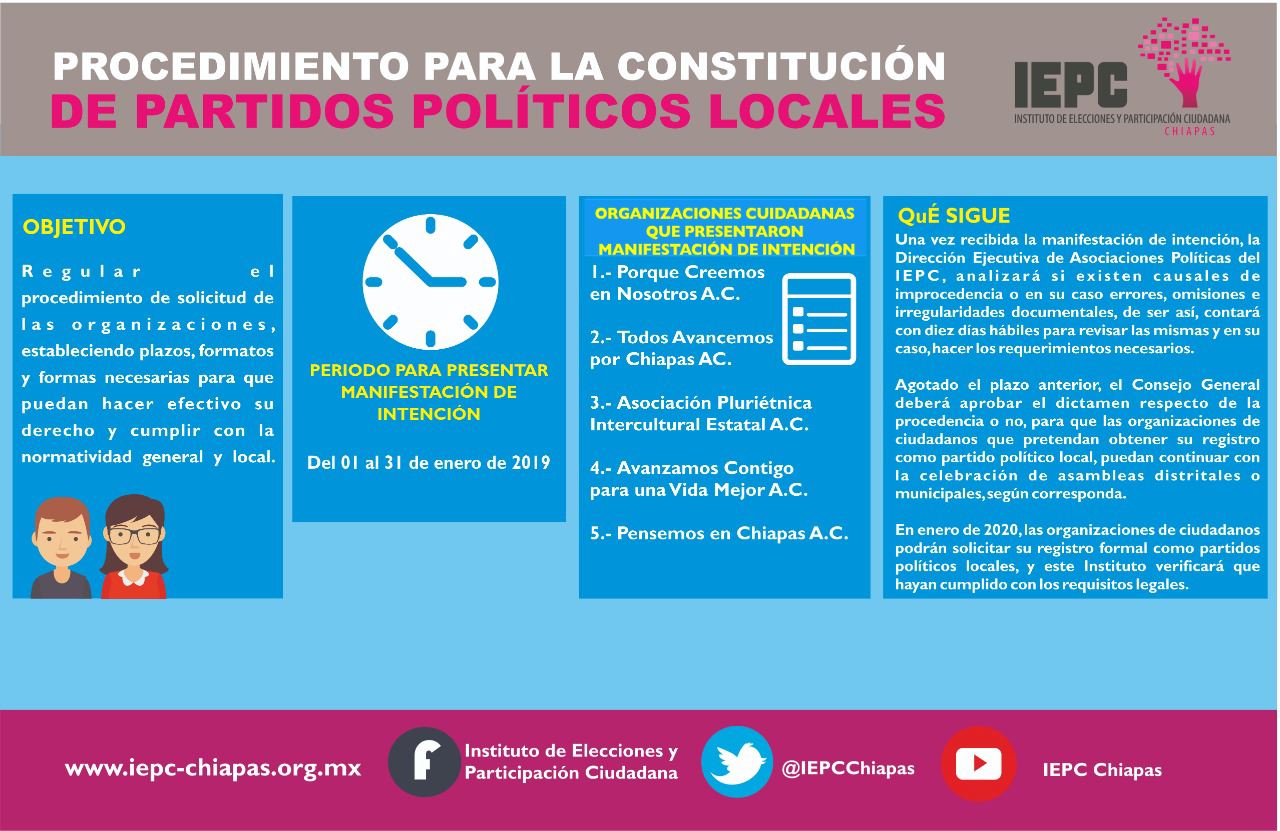 En términos del artículo 16 del Reglamento para el Registro de Partido Políticos en el Estado de Chiapas, este jueves 31 de enero, a las 23:59 horas, concluyó el plazo para que las organizaciones de ciudadanos interesados en constituir un Partido Político Local, presentarán ante el Instituto de Elecciones y Participación Ciudadana (IEPC) de Chiapas, su escrito de intención acompañado de la documentación que la propia normatividad exige. Estas organizaciones son: “Porque Creemos en Nosotros A.C.”, “Todos Avancemos por Chiapas AC.”, “Asociación Pluriétnica Intercultural Estatal A.C.”, “Avanzamos Contigo para una Vida Mejor A.C.” y “Pensemos en Chiapas A.C.”.