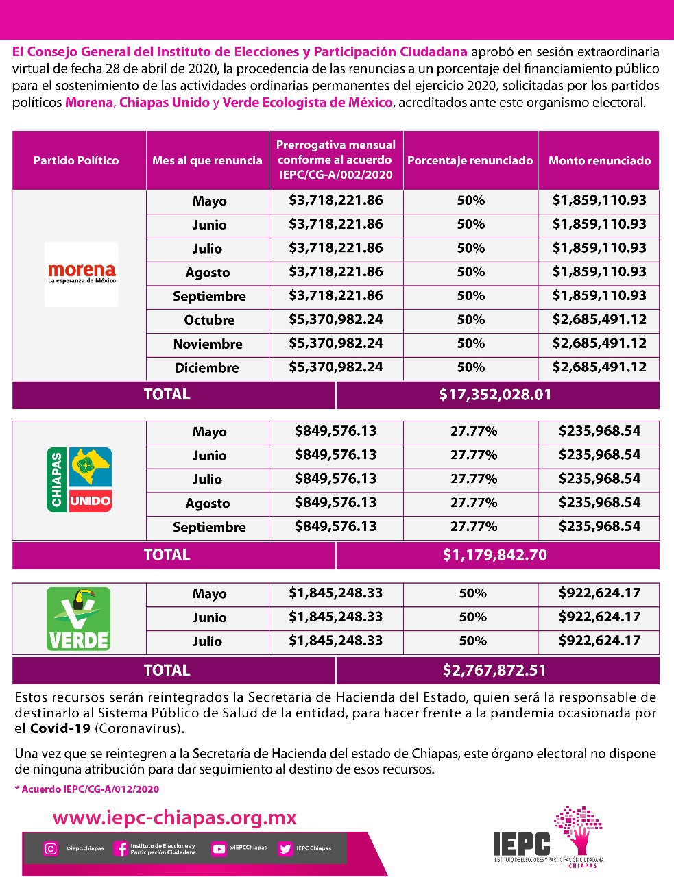 El partido Morena renunció al 50% de su recurso público, del periodo que comprende de mayo a diciembre de 2020, correspondiente a 17 millones 352 mil 028.01 pesos. Mientras que el partido Chiapas Unido renunció a su financiamiento del periodo de mayo a septiembre, correspondiente a 1 millón 179 mil 842.7 pesos y el Partido Verde Ecologista de México renunció a sus recursos del periodo que va de mayo a julio, correspondientes a 2 millones 767 mil 872.51 pesos.