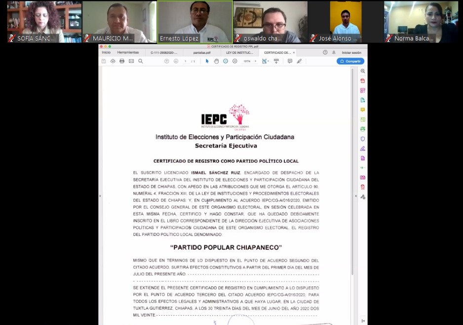 En un acto protocolario virtual, el Instituto de Elecciones y Participación Ciudadana (IEPC) de Chiapas realizó la entrega del Certificado del Registro del Partido Popular Chiapaneco (PPCH) que lo acredita como Partido Político Local. Lo anterior, en cumplimiento a lo dispuesto en el artículo 19 de la Ley General de Partidos Políticos, y lo establecido en el punto resolutivo tercero del Acuerdo IEPC/CG-A/016/2020.