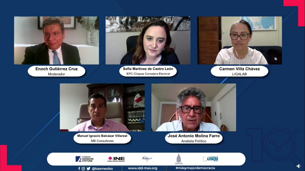 Durante el desarrollo del foro virtual, la consejera electoral Sofía Martínez De Castro León, participó en el panel de discusión: 10 años de la Democracia en México, junto a Carmen Villa Chávez, Directora de Ligalab A.C.; Manuel Ignacio Balcázar Villarreal, Director de MB Consultores y José Antonio Molina Farro, Analista Político, bajo la moderación de Enoch Gutiérrez Cruz, integrante de Coparmex Chiapas.
