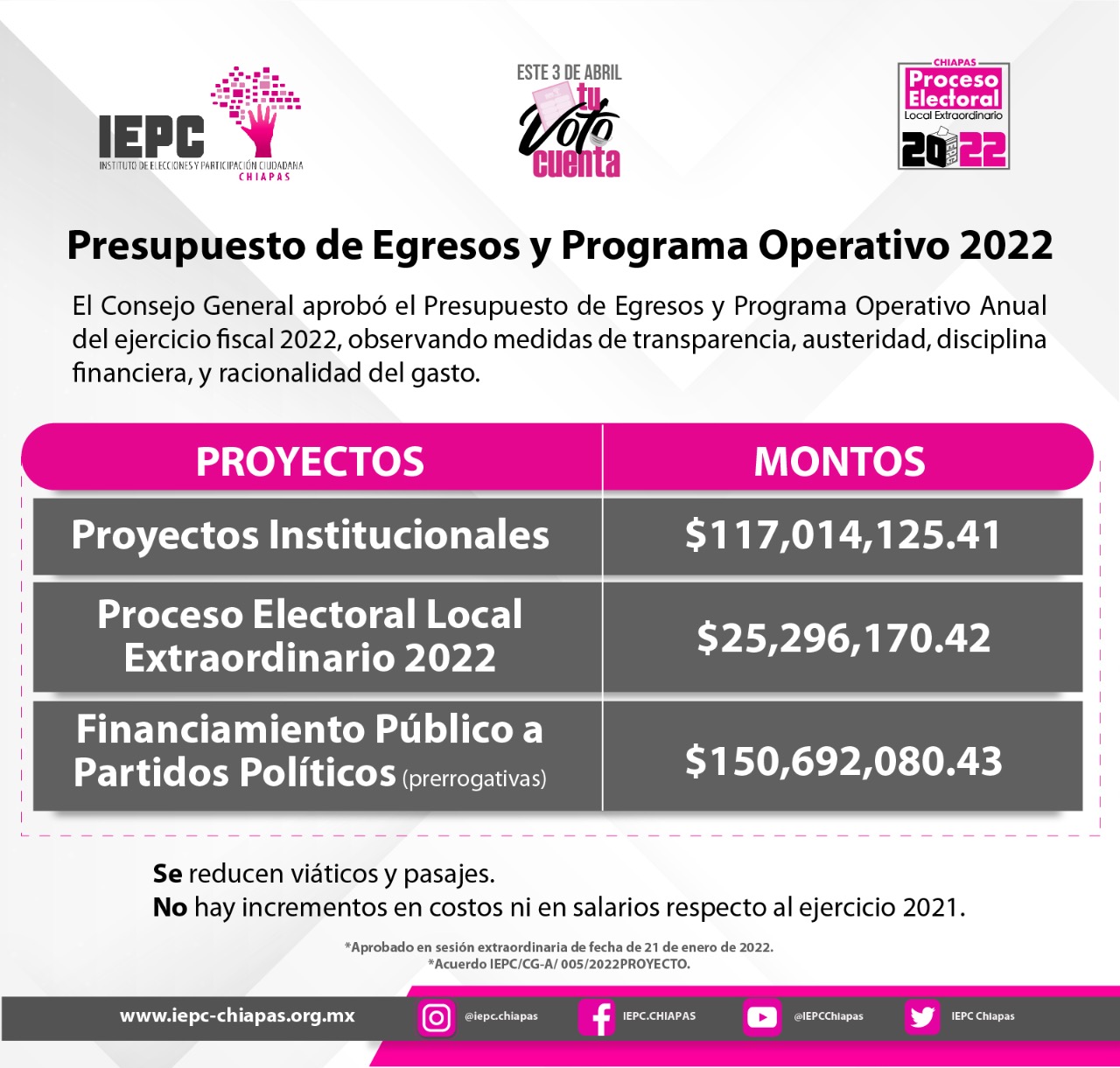 En sesión extraordinaria, el Consejo General del Instituto de Elecciones y Participación Ciudadana (IEPC) de Chiapas, aprobó el Presupuesto de Egresos y Programa Operativo Anual de este organismo para el ejercicio fiscal 2022, consistente en 150 millones 692 mil 080 pesos para los partidos políticos con acreditación y registro ante este órgano electoral, 117 millones 014 mil 125.41 pesos para las Actividades Ordinarias y Programa Operativo Anual del IEPC y 25 millones 296 mil 170.42 pesos para la organización de los comicios extraordinarios por los que se elegirán integrantes de Ayuntamientos en El Parral, Emiliano Zapata, Frontera Comalapa, Honduras de la Sierra, Siltepec y Venustiano Carranza. Es decir, 293 millones 253 mil 262.15 pesos, con base en lo aprobado por el H. Congreso del Estado.
