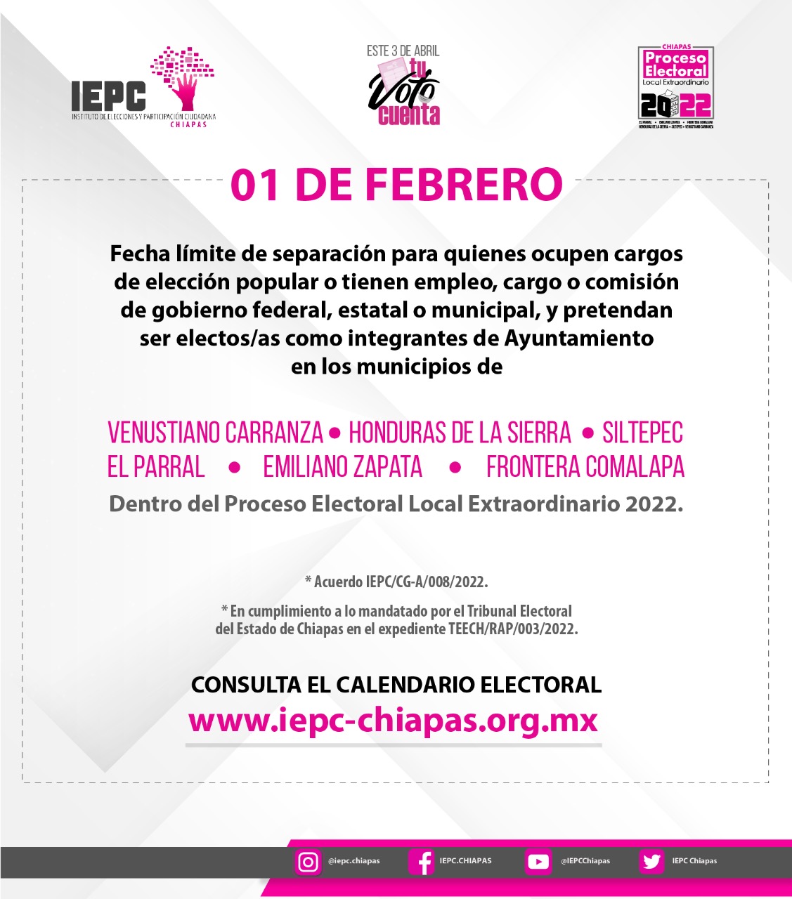 En sesión urgente, el Instituto de Elecciones y Participación Ciudadana (IEPC) de Chiapas, aprobó por unanimidad, una modificación al Calendario de actividades del Proceso Electoral Local Extraordinario 2022, para elegir a miembros de Ayuntamiento en los municipios de Venustiano Carranza, Honduras de la Sierra, Siltepec, El Parral, Emiliano Zapata y Frontera Comalapa, y cuya fecha de realización de los comicios será el próximo 3 de abril de este año. Lo anterior, en cumplimiento a una sentencia del Tribunal Electoral del Estado (TEECH) y en observancia al acuerdo INE/CG10/2022 del Instituto Nacional Electoral (INE).