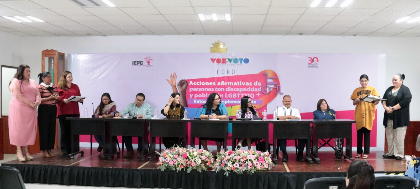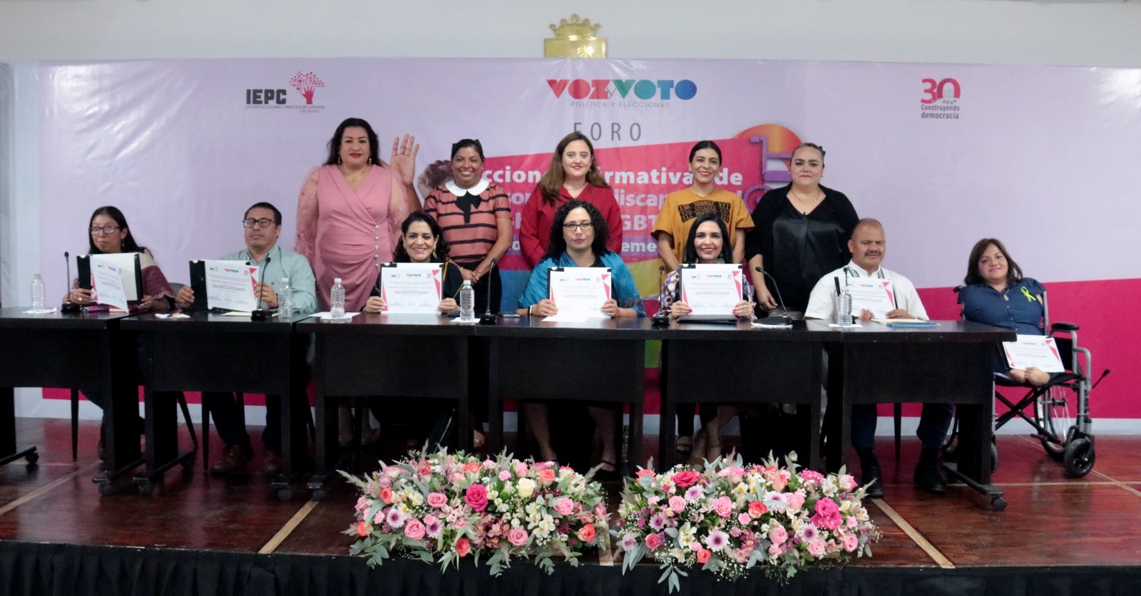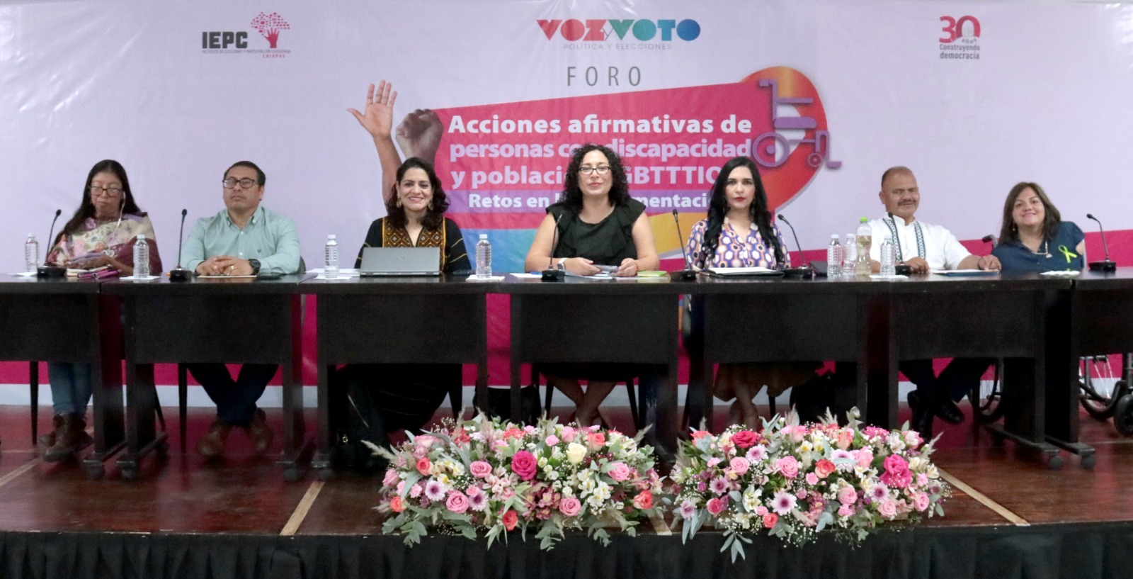 El panel, moderado por Gloria Alcocer Olmos, directora de la revista Voz y Voto, estuvo integrado por Marina Martha López Santiago, titular de la Defensoría Pública Electoral del Tribunal Electoral del Poder Judicial de la Federación; Celia Sofía de Jesús Ruiz Olvera, Magistrada Electoral del Tribunal Electoral del estado de Chiapas; Ernesto López Hernández, Titular de la Fiscalía de Delitos Electorales de la Fiscalía General del estado de Chiapas; Luz María Castillo Moreno, diputada local en la LXIX Legislatura del Congreso del estado de Chiapas, electa por la acción afirmativa de discapacidad; Elizabeth Patricia Pérez Santiz, activista defensora de personas en situación de discapacidad y presidenta de Amor sin Fronteras A.C; así como Gerardo de Jesús Hernández Morales, maestro especializado en atención a la discapacidad visual.