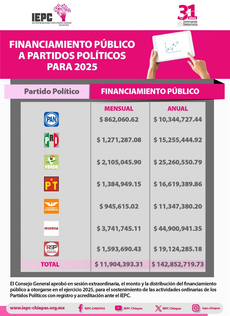 Durante esta sesión, también se aprobó el acuerdo del Consejo General del Instituto de Elecciones y Participación por el que, a propuesta de la Junta General Ejecutiva, se aprueba la determinación del monto y la distribución del financiamiento público a otorgarse en el ejercicio 2025, para el sostenimiento de las actividades ordinarias permanentes de los partidos políticos acreditados y con registro ante este organismo electoral local por un total de 142 millones 852 mil 719.73 pesos.