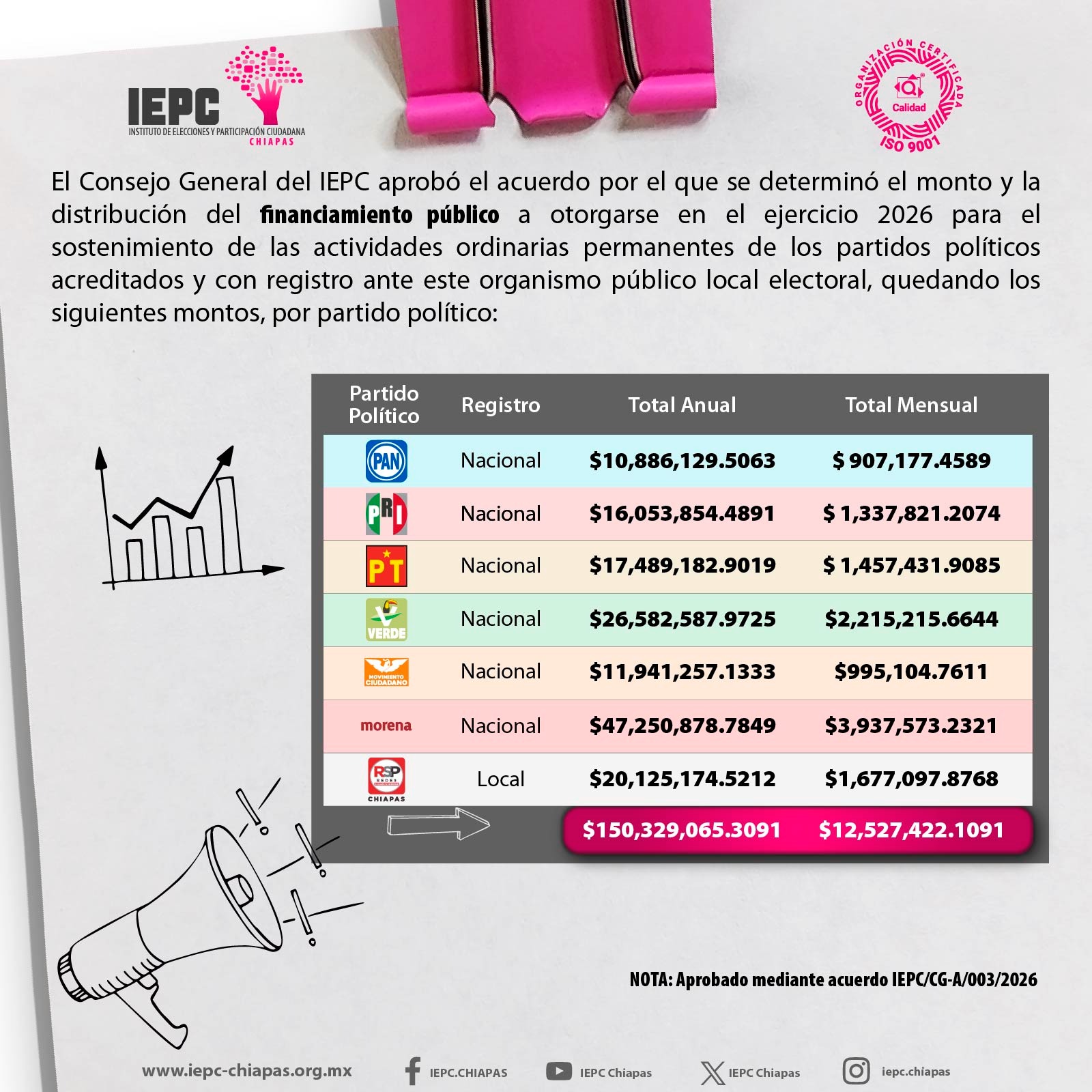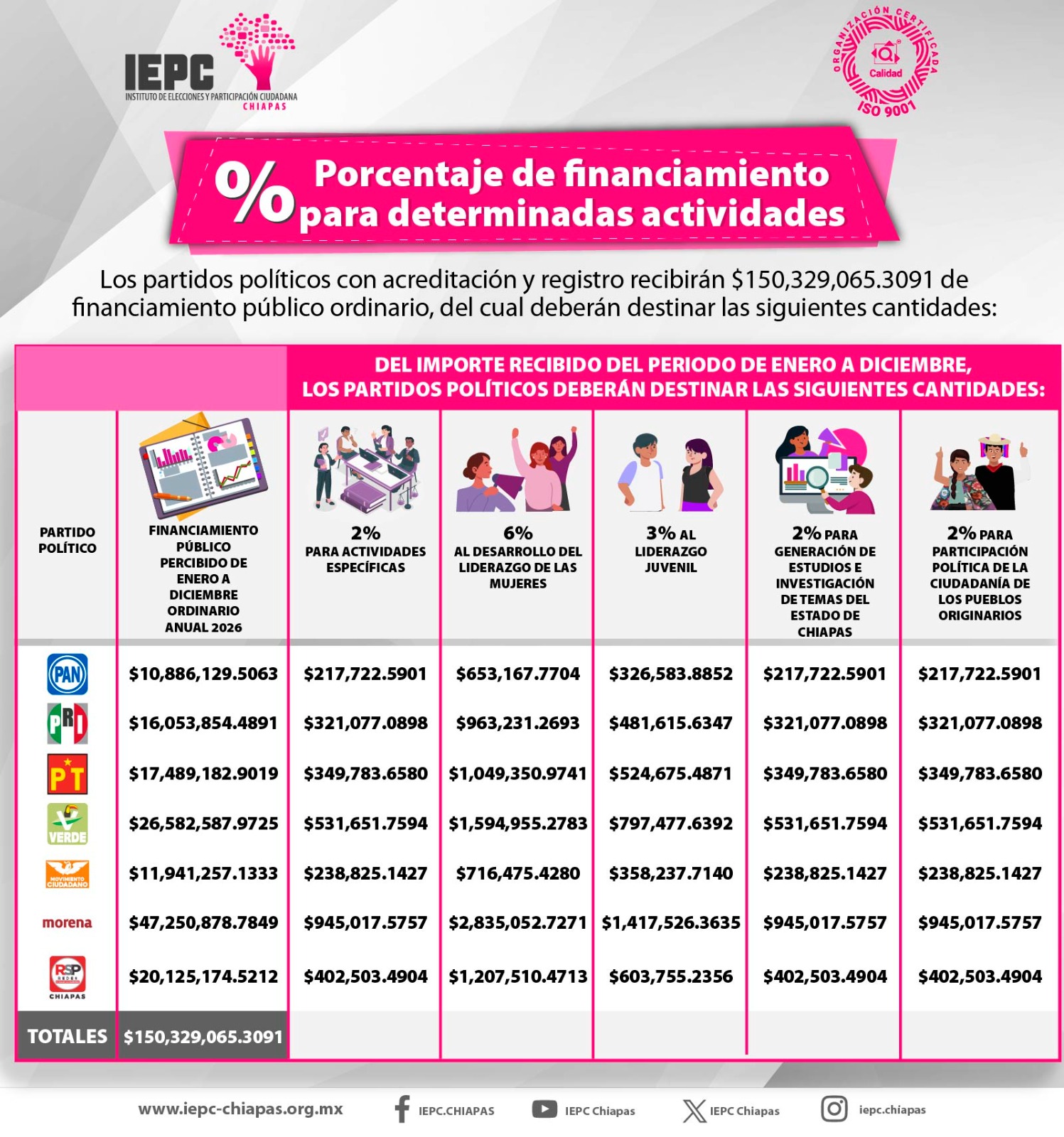 Asimismo, para el financiamiento público a partido políticos con acreditación y registro, se aprobó la determinación del monto y la distribución del financiamiento público a otorgarse en el ejercicio 2026 para el sostenimiento de las actividades ordinarias permanentes de los partidos políticos acreditados y con registro ante este organismo público local electoral, por un monto de 150 millones 329 mil 065 pesos.