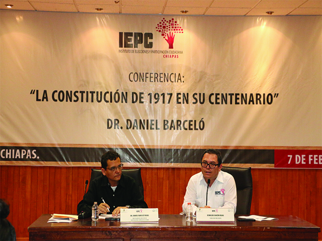 Daniel Barceló Rojas señaló durante su conferencia magistral que “en México seguimos avanzando en orden y paz social gracias a esa Constitución de 1917”. Acompañado por Oswaldo Chacón Rojas, Consejero Presidente del IEPC, Barceló Rojas destacó que al hacer el homenaje a la Constitución, es importante valorar lo mucho que este documento nos ha aportado a los mexicanos en cien años de vida “consideren ustedes, para que puedan valorar esto, que otros países se han erosionado, se han disuelto literalmente en este mismo lapso de tiempo”, señaló.