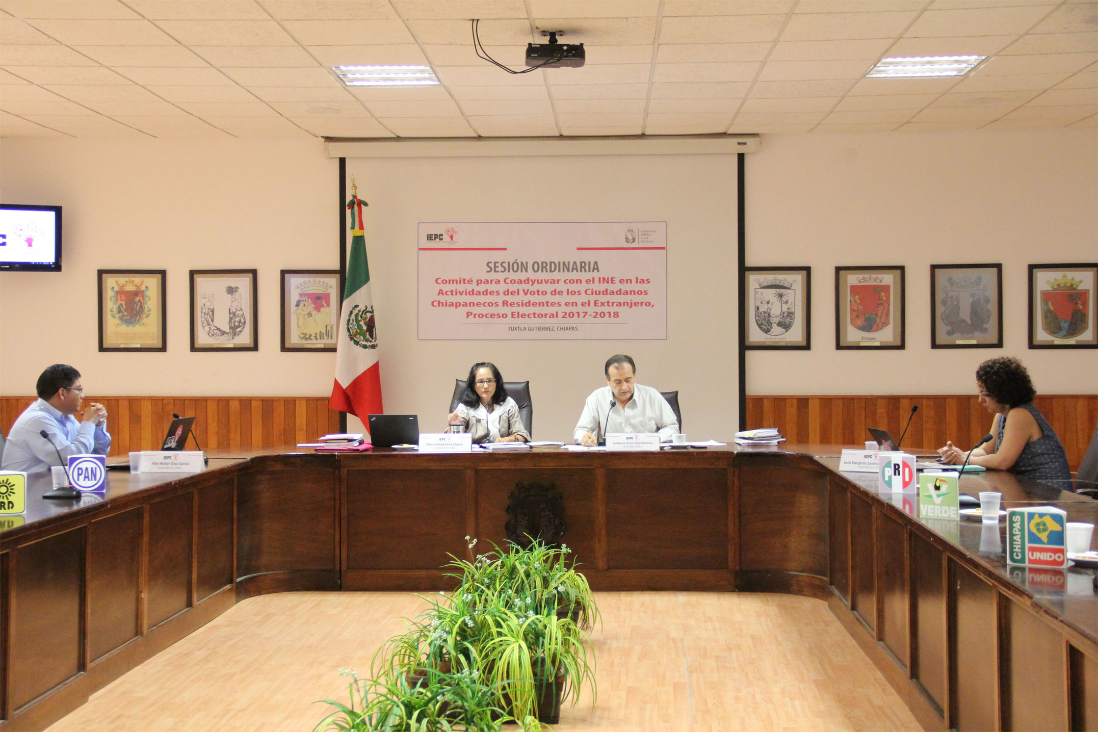El Comité para coadyuvar con el INE en las actividades del voto de los ciudadanos chiapanecos residentes en el extranjero para el proceso electoral 2017-2018 estará integrado de la siguiente manera: la consejera electoral Blanca Estela Parra Chávez en su calidad de presidenta; la consejera electoral, Sofía Margarita Sánchez Domínguez y el consejero electoral, Alex Walter Díaz García como integrantes; Guillermo Arturo Rojo Martínez, Secretario Técnico y habrá un representante de cada partido político.