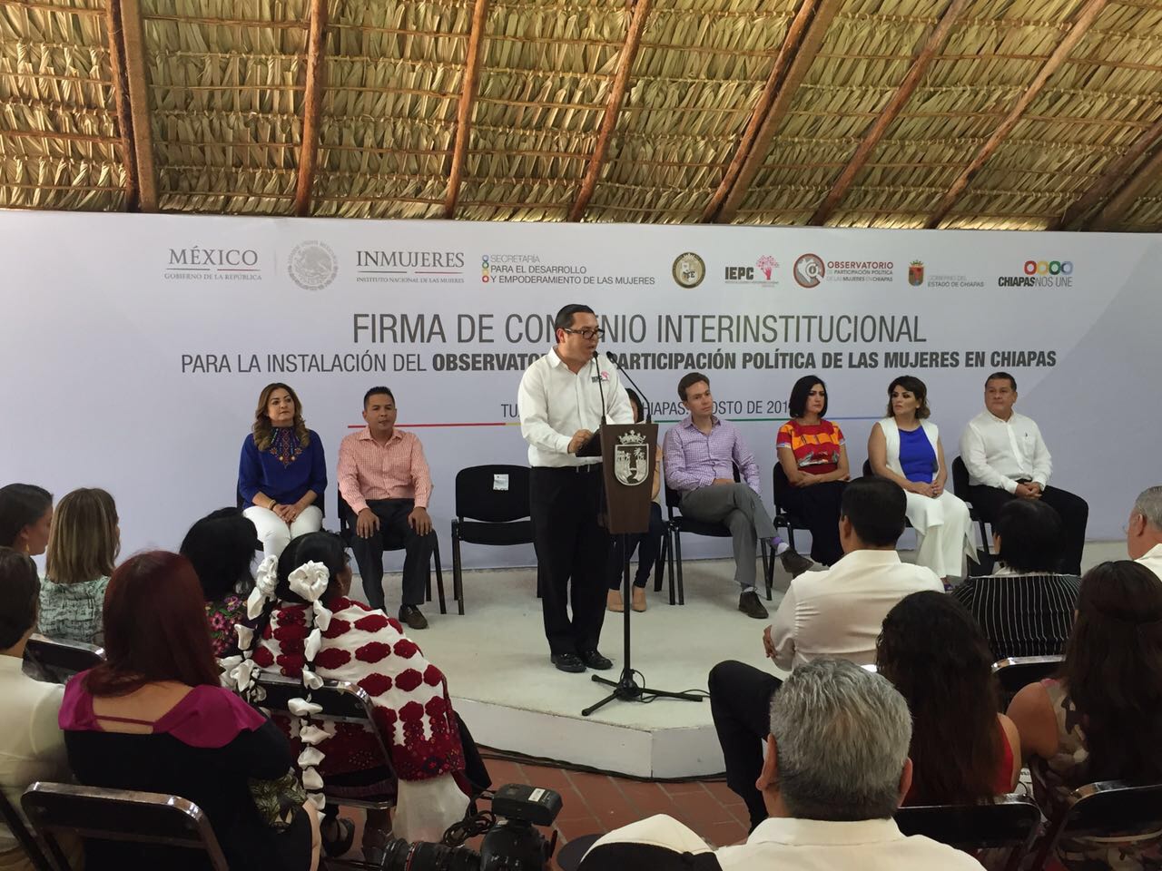 Tuxtla Gutiérrez, Chiapas a 16 de agosto de 2017.- El día de ayer se llevó a cabo la firma de Convenio Interinstitucional para la Instalación del Observatorio de Participación Política de las Mujeres en Chiapas, que tiene como objetivo general recopilar y compartir información que visibilice la situación de las mujeres en el Estado, las estrategias de empoderamiento en distintas instituciones, además de los esquemas, metodologías y estrategias para lograr la igualdad sustantiva en todos los ámbitos, en dicho observatorio convergen el Instituto de Elecciones y Participación Ciudadana (IEPC), el Tribunal Electoral del Estado, así como Secretaría para el Desarrollo y Empoderamiento de las Mujeres. En el evento se contó con la presencia como testigos de honor del Gobernador del Estado, Manuel Velasco Coello y la Presidenta del Instituto Nacional de las Mujeres, Lorena Cruz Sánchez.