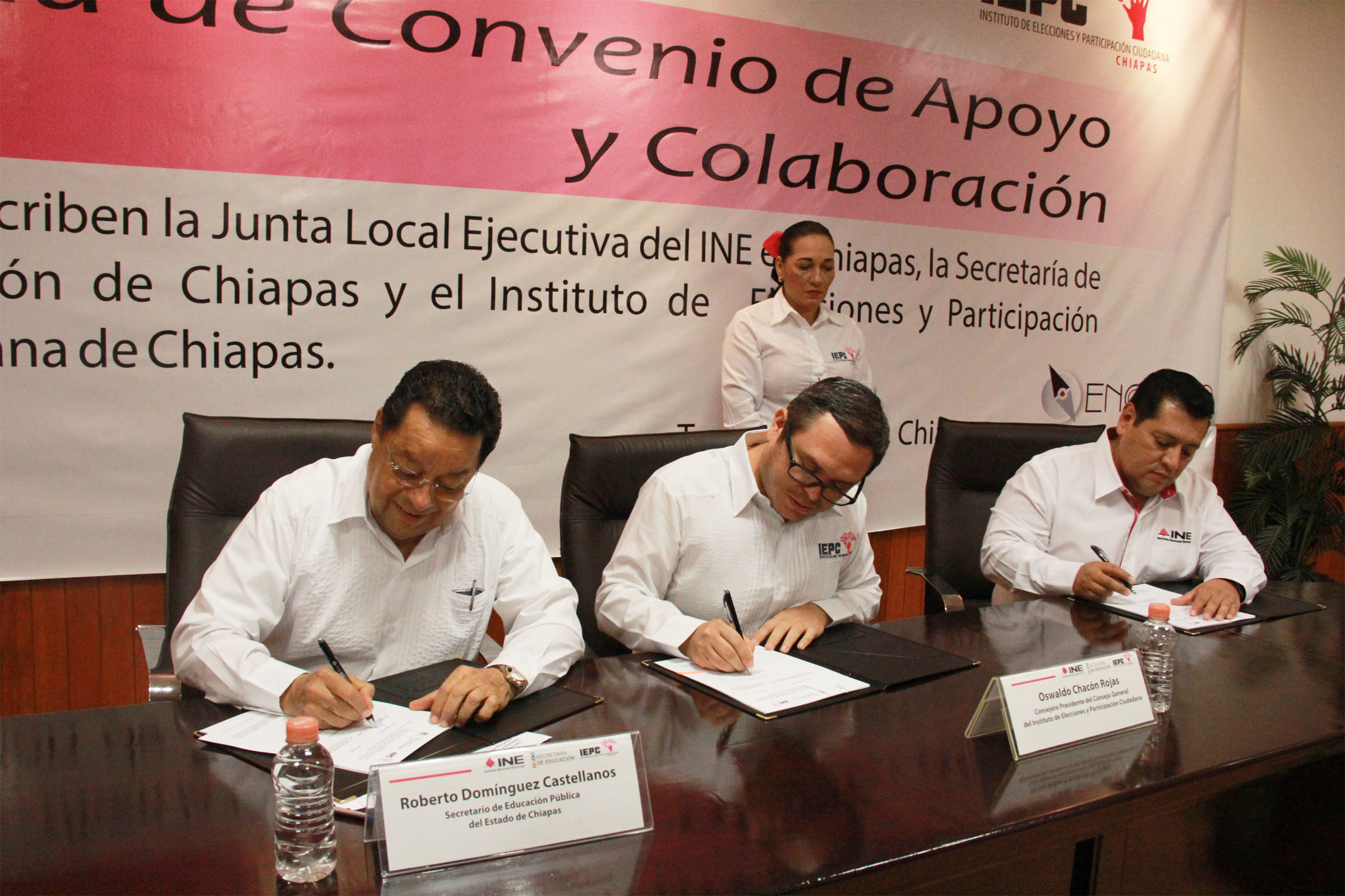 Tuxtla Gutiérrez.- El vocal Ejecutivo de la Junta Local del INE, José Luis Vázquez López; el consejero presidente del Instituto de Elecciones y Participación Ciudadana de Chiapas (IEPC), Oswaldo Chacón Rojas y el secretario de Educación Estatal, Roberto Domínguez Castellanos,llevaron a cabo la firma de un convenio de apoyo y colaboración institucional en la sala de sesiones “Dr. Manuel Ovilla Mandujano” del IEPC, con sede en esta ciudad.
