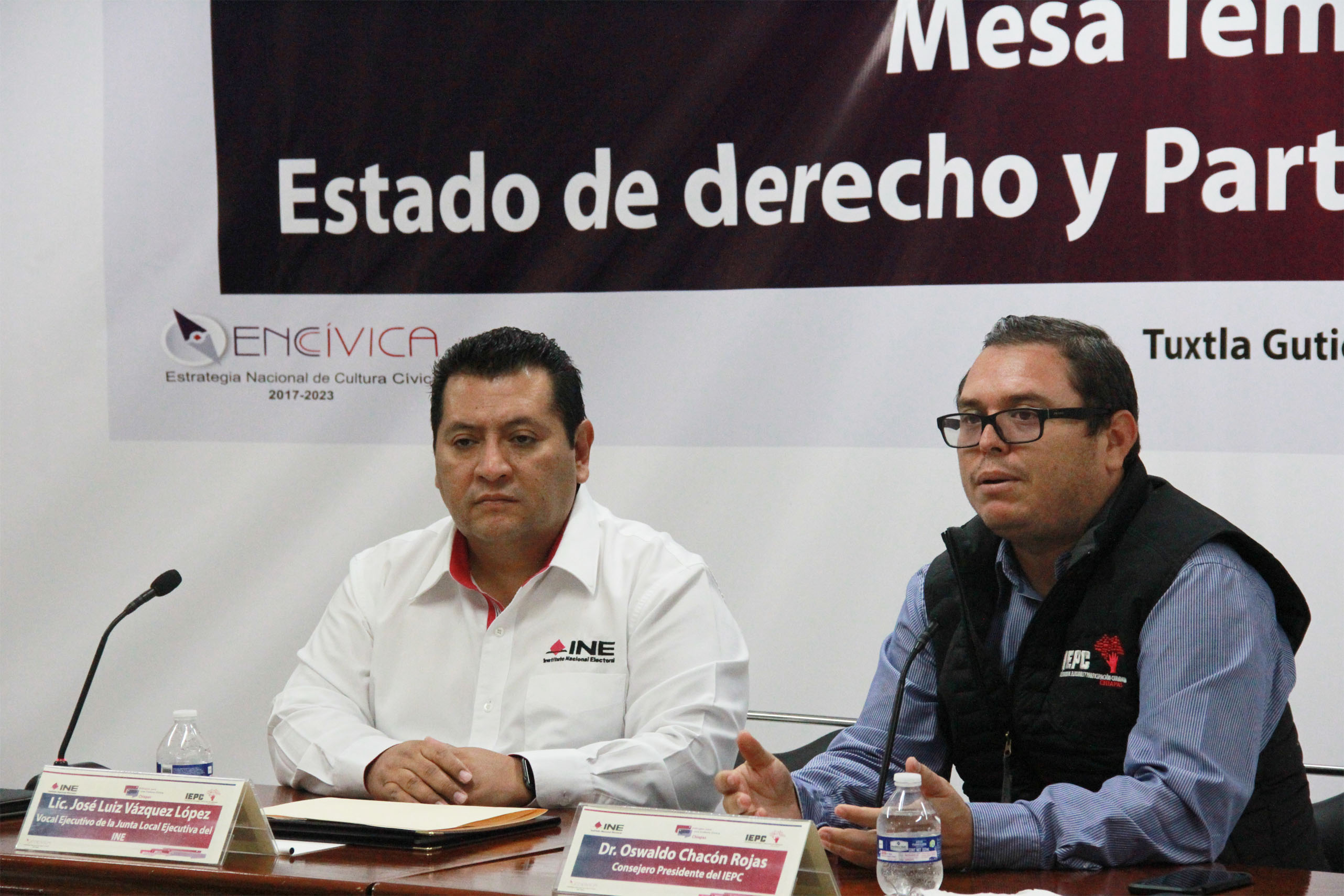Por su parte, el Consejo Presidente del IEPC, Oswaldo Chacón Rojas, recalcó la importancia de la celebración de esta mesa, y señaló que el reto que tenemos como sociedad no nada más es salir a votar en las próximas elecciones sino también en participar en la organización de las mismas, “ya que necesitamos que la ciudadanía participe como integrante las mesas directivas de casillas y todo lo que ello conlleva como responsabilidad ciudadana”. Indicó que es precisamente a través de la Estrategia Nacional de Cultura Cívica como se busca impactar en el cambio de actitudes y valores hacia la vida pública de este país, a efecto de lograr un mayor compromiso cívico, una mayor responsabilidad de los chiapanecos y de las chiapanecas con estos deberes de participación en las cuestiones públicas.