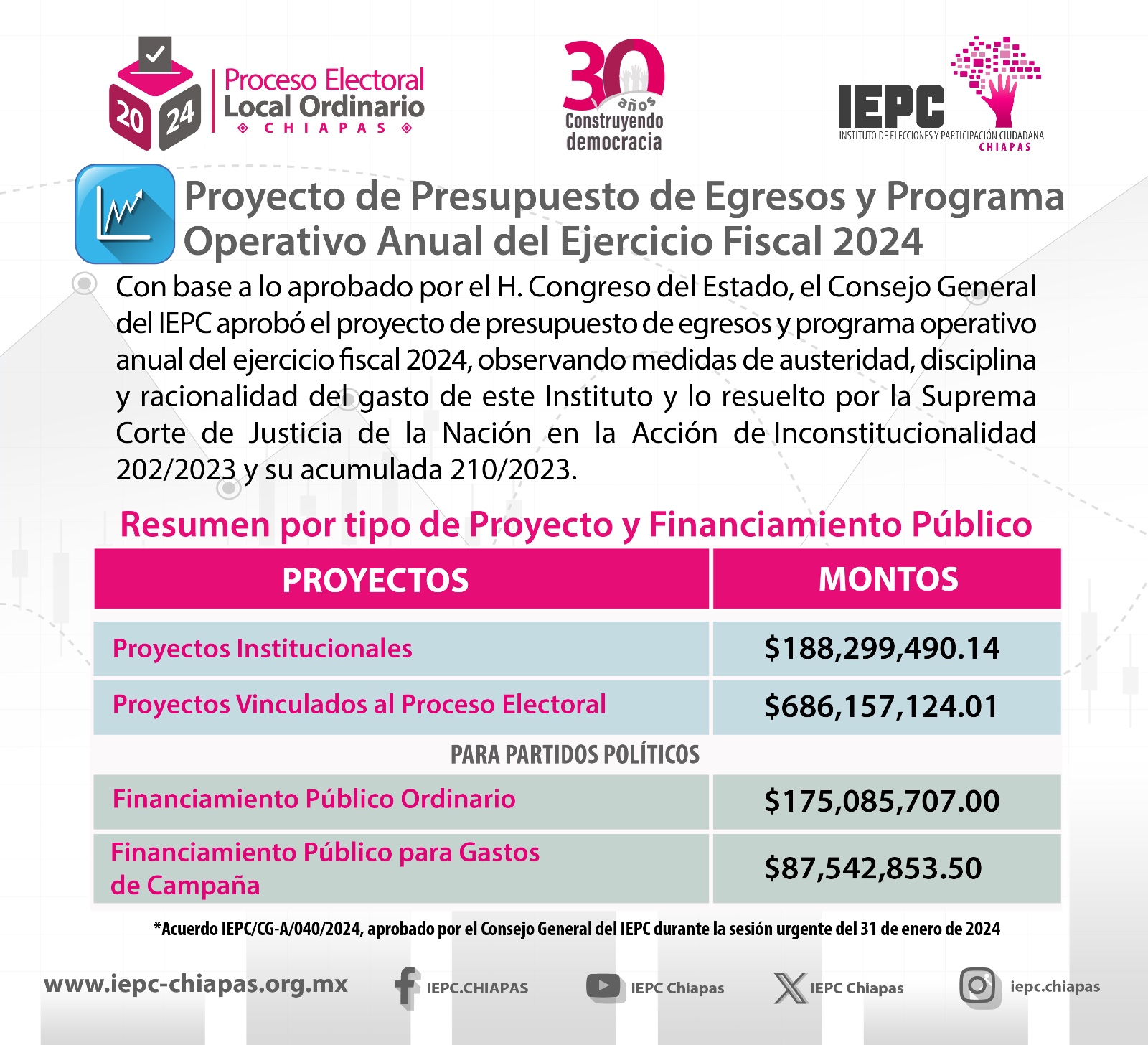 * En sesión urgente, aprueba asuntos medulares para el desarrollo del proceso electoral: el financiamiento público ordinario y el financiamiento público para gastos de campaña para partidos políticos.