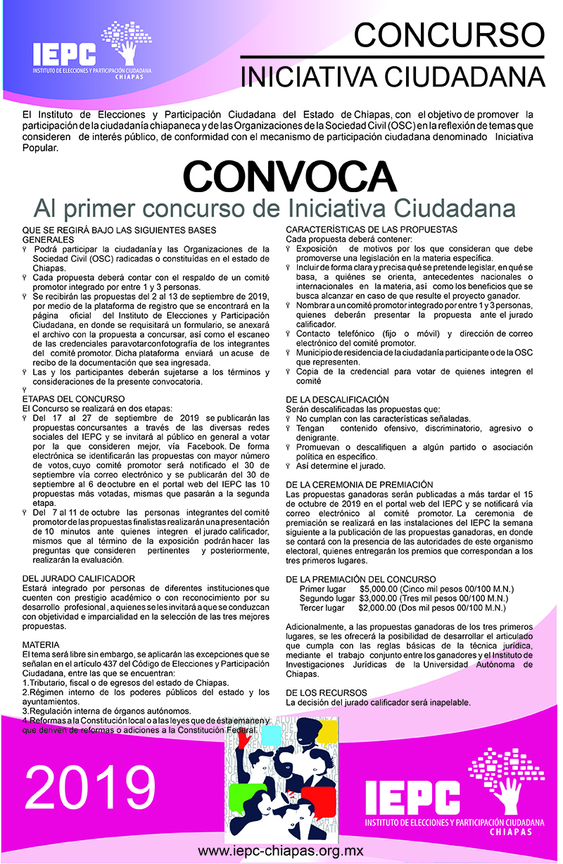 Concurso de Iniciativa Ciudadana Regístrate aquíNOTA: Para registrarte es necesario contar con una cuenta gmail Concurso de Iniciativa Ciudadana Convocatoria PDF Aviso de privacidad Integral Aviso de privacidad Simplificado