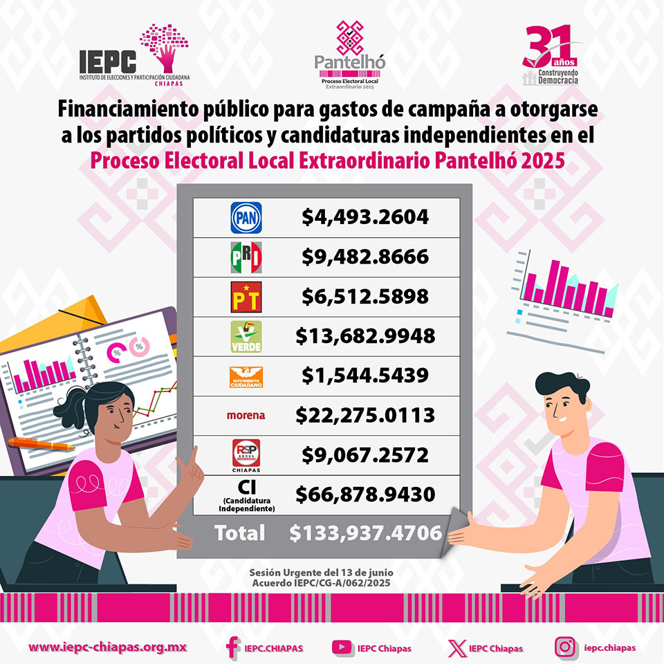 El Instituto de Elecciones y Participación Ciudadana de Chiapas aprueba anualmente la proyección del monto del financiamiento público a otorgarse a los Partidos Políticos con registro y acreditación conforme a la normatividad vigente.