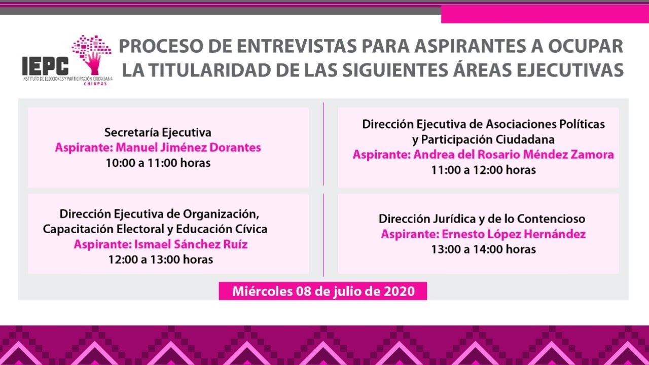 ENTREVISTA a Candidatos (as) a Puestos Directivos, 8Jul2020 ENTREVISTA a Candidatos (as) a Puestos Directivos8 de Julio de 2020 10:00 horas