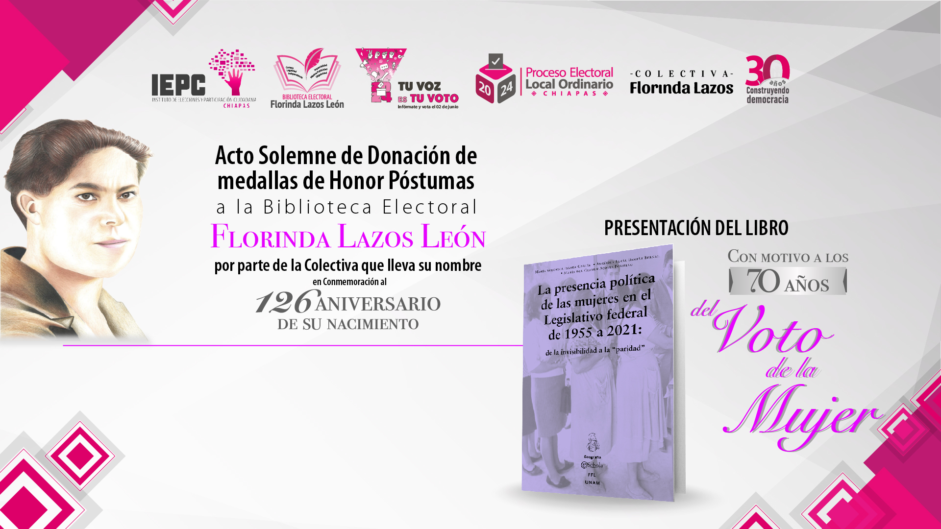 Presentación del libro "Setenta años del Voto de la Mujer", y con motivo a los 126 aniversario del nacimiento de Florinda Lazos León Primera Mujer Electa Diputada en Chiapas, la colectiva que lleva su nombre depositara las Medallas de Honor póstumas, en la Biblioteca Electoral "Florinda Lazos León"