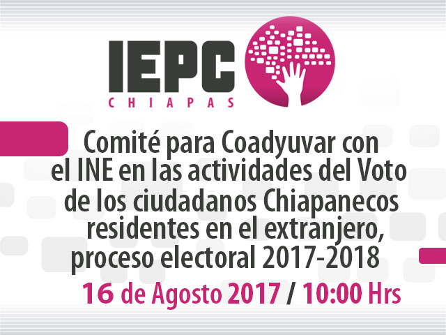 Comité para Coadyuvar con el INE en las actividades del voto en el Extranjero, Agosto Comité para Coadyuvar con el INE en las actividades del voto de los ciudadanos Chiapanecos residentes en el extranjero, proceso electoral 2017-2018 16 de Agosto de 2017 10:00 horas